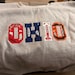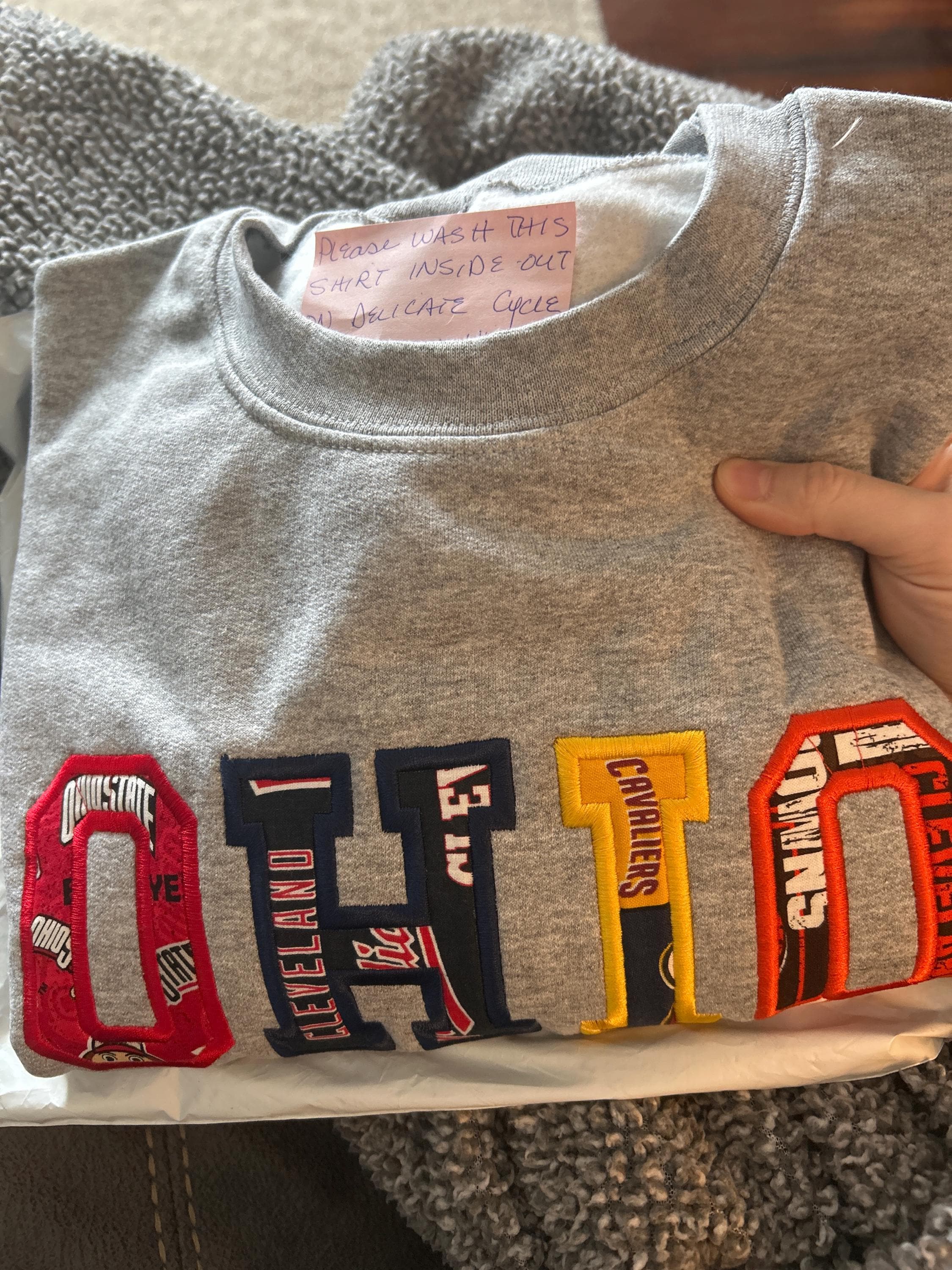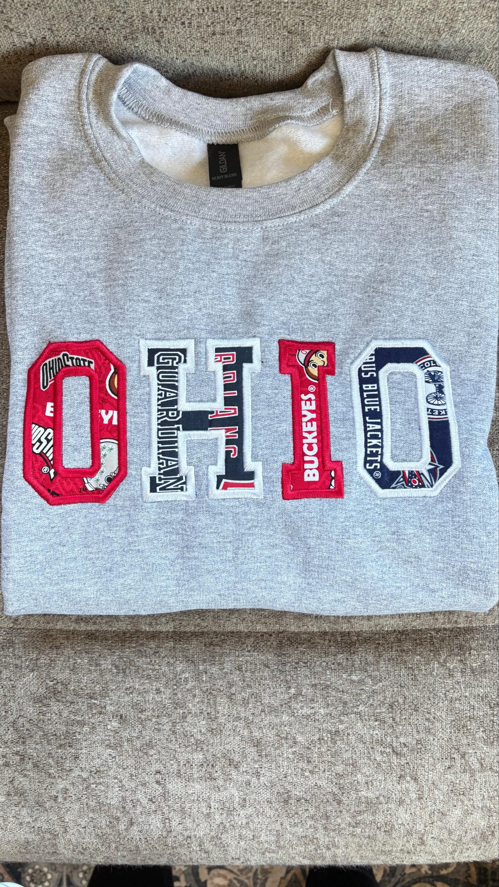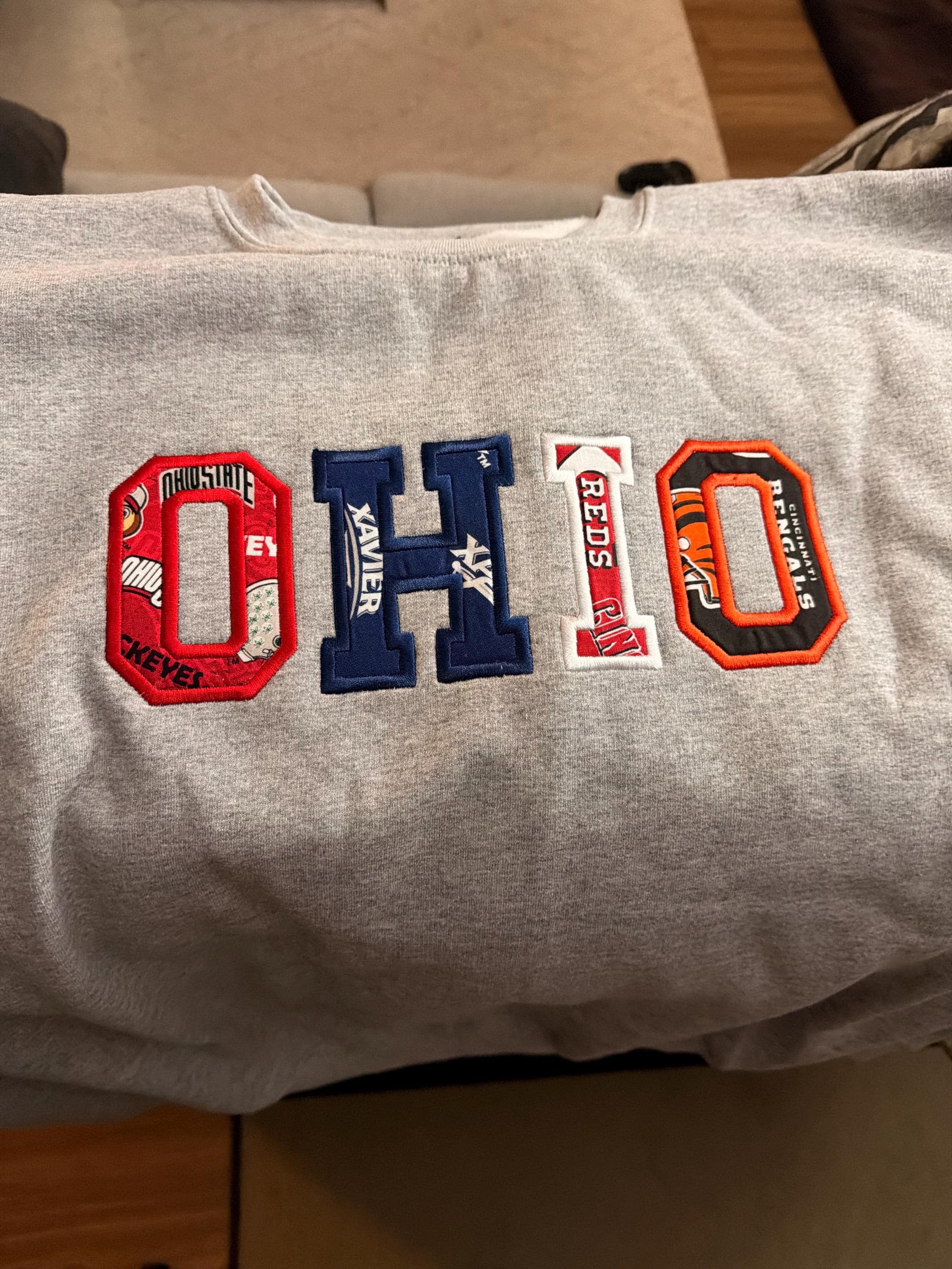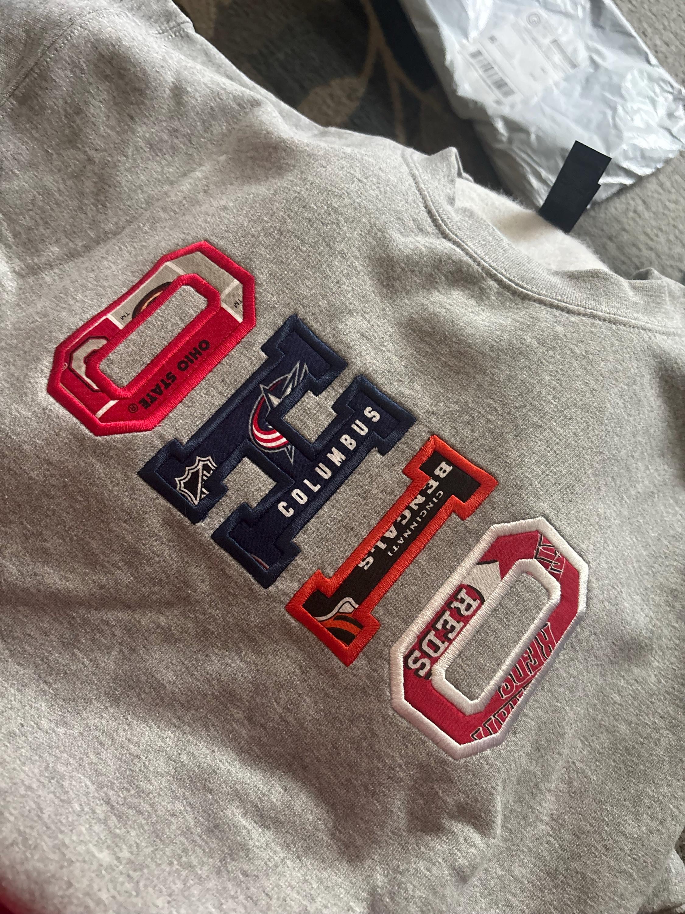 Custom Ohio applique sweatshirt. Choose the color of sweatshirt and the teams you want for each Letter. Choices include Cincinnati Reds, Bengals, Guardians, Cavaliers, Columbus Blue Jackets, buckeyes, Ohio Bobcats and Youngstown Penguins. Sizes are Small, Medium, Large, Extra Large, XXL.